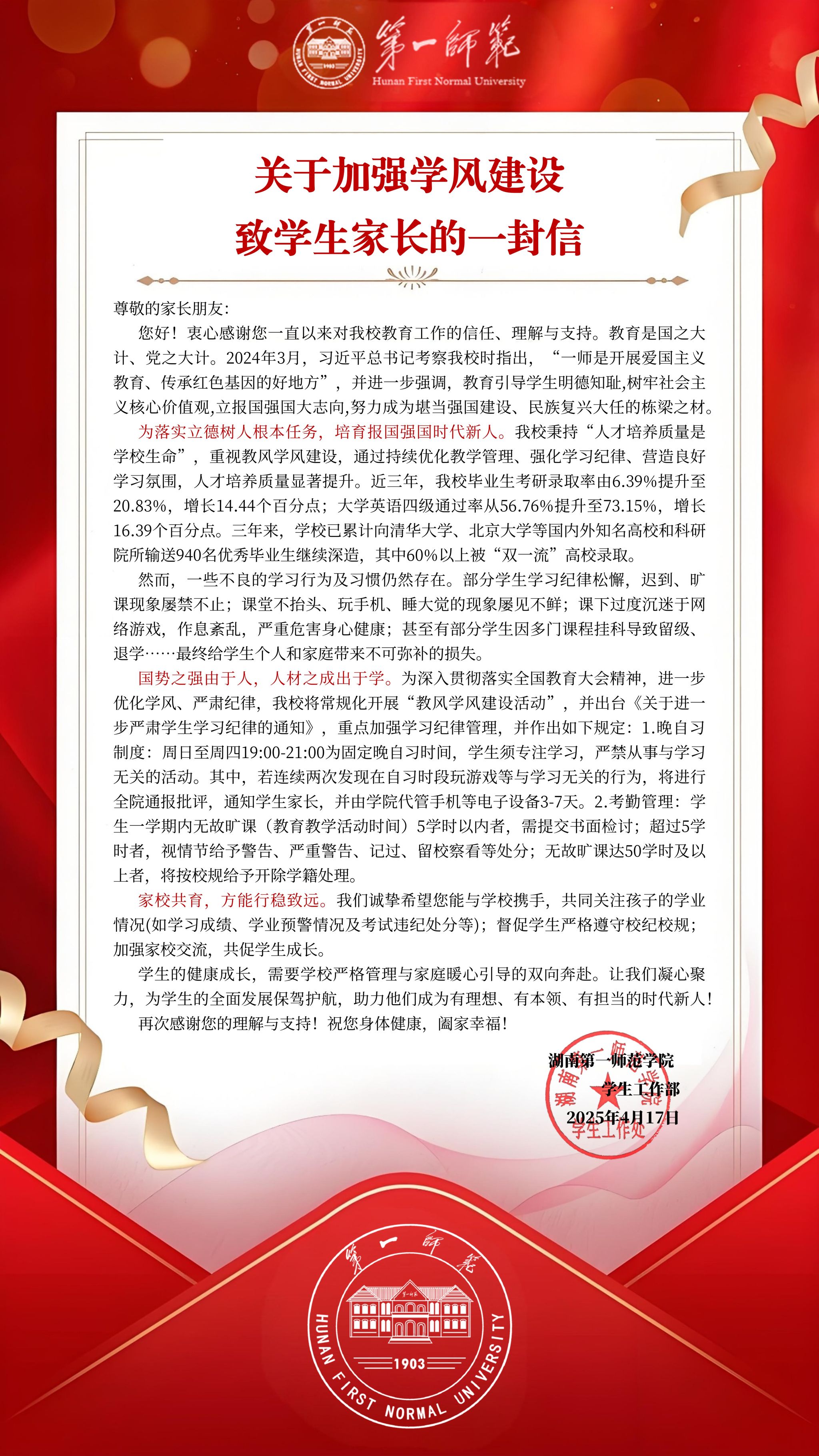 关于加强学风建设致员工家长的一封信